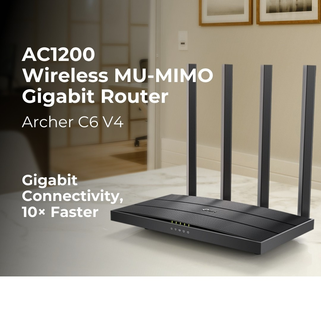 The TP-Link Archer C6 AC1200 is a high-performance dual-band Gigabit router designed to deliver smooth streaming, lag-free gaming, and reliable internet throughout your home or small office. Offering combined wireless speeds of up to 1200 Mbps (300 Mbps on 2.4GHz and 867 Mbps on 5GHz), it ensures fast and stable connectivity for all your devices. Its four external antennas and one internal antenna provide wide coverage, while MU-MIMO technology allows multiple devices to enjoy high-speed Wi-Fi simultaneously, reducing congestion and improving network efficiency.